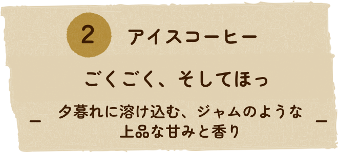 アイスコーヒーは夕暮れ時のビーチでほっと一息つきながら飲む、そんなイメージはどうだろうか。