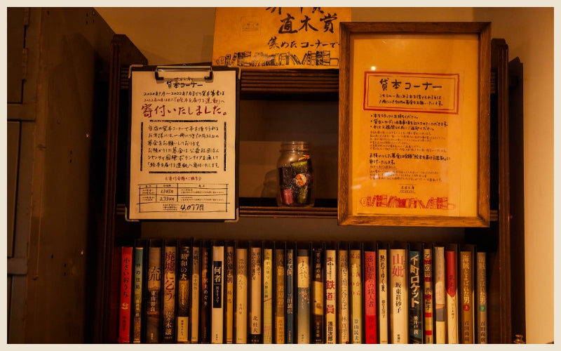 テーブル一つ一つに異なるテーマの本を置いており、「宇宙」「数学」「落語」などさまざまなテーマの本が楽しめます。また、今月おすすめの本のコーナーや、芥川賞や直木賞受賞作品のコーナーがあります。芥川賞直木賞コーナーの本は50円で貸し出しており、売上は「絵本を届ける運動」へ寄付しています。