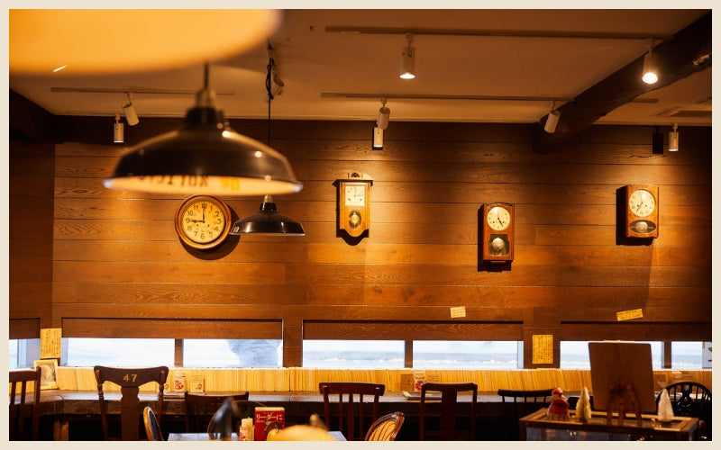 店内の壁にはたくさんの時計がかかっているのですが、実際に動いている時計は一つだけなんです。