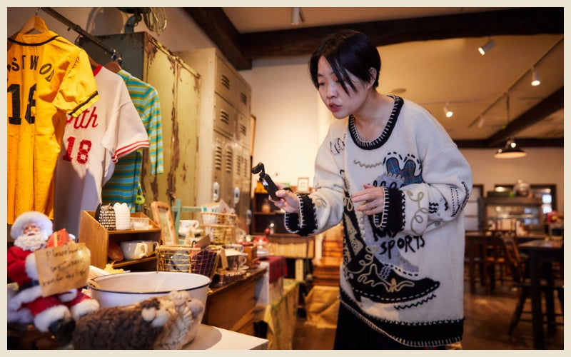 お店の入口には趣のある引き戸があり、店内には、アンティークな家具やインテリアの数々を並べています。フランスの蚤の市で購入したアンティークミルや、どこか昭和レトロな雰囲気を醸し出しているお菓子の缶など、店内の細部まですべて“アンティーク”にこだわっています。